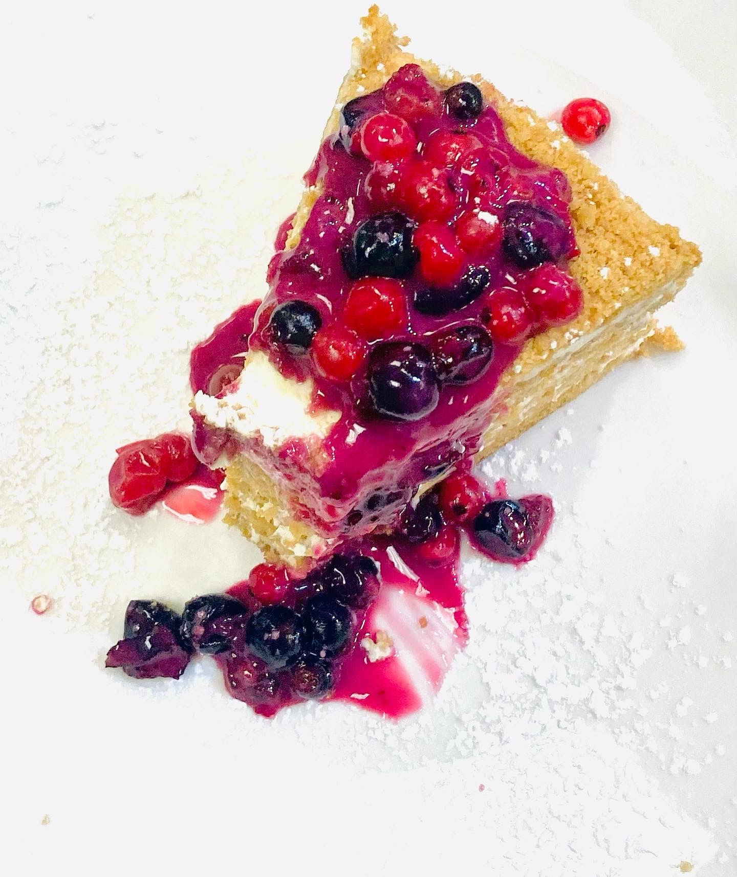 Sour Cherry Cream Diplomat, white chocolate ganage, powder sugar, whipped cream. $18CA $18.54CC